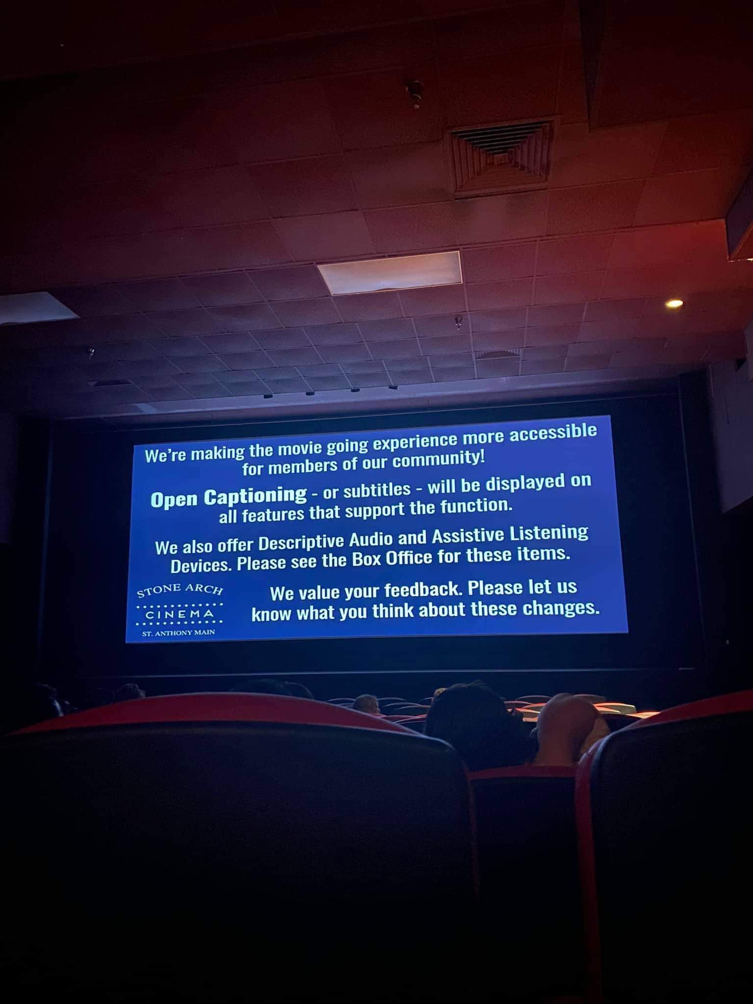 Having a local movie theater that provides open captions on all movies at all times, every day, is a huge step forward in accessibility and moves us closer to full and equal access. Please spread the news about open captions at St. Anthony Main.