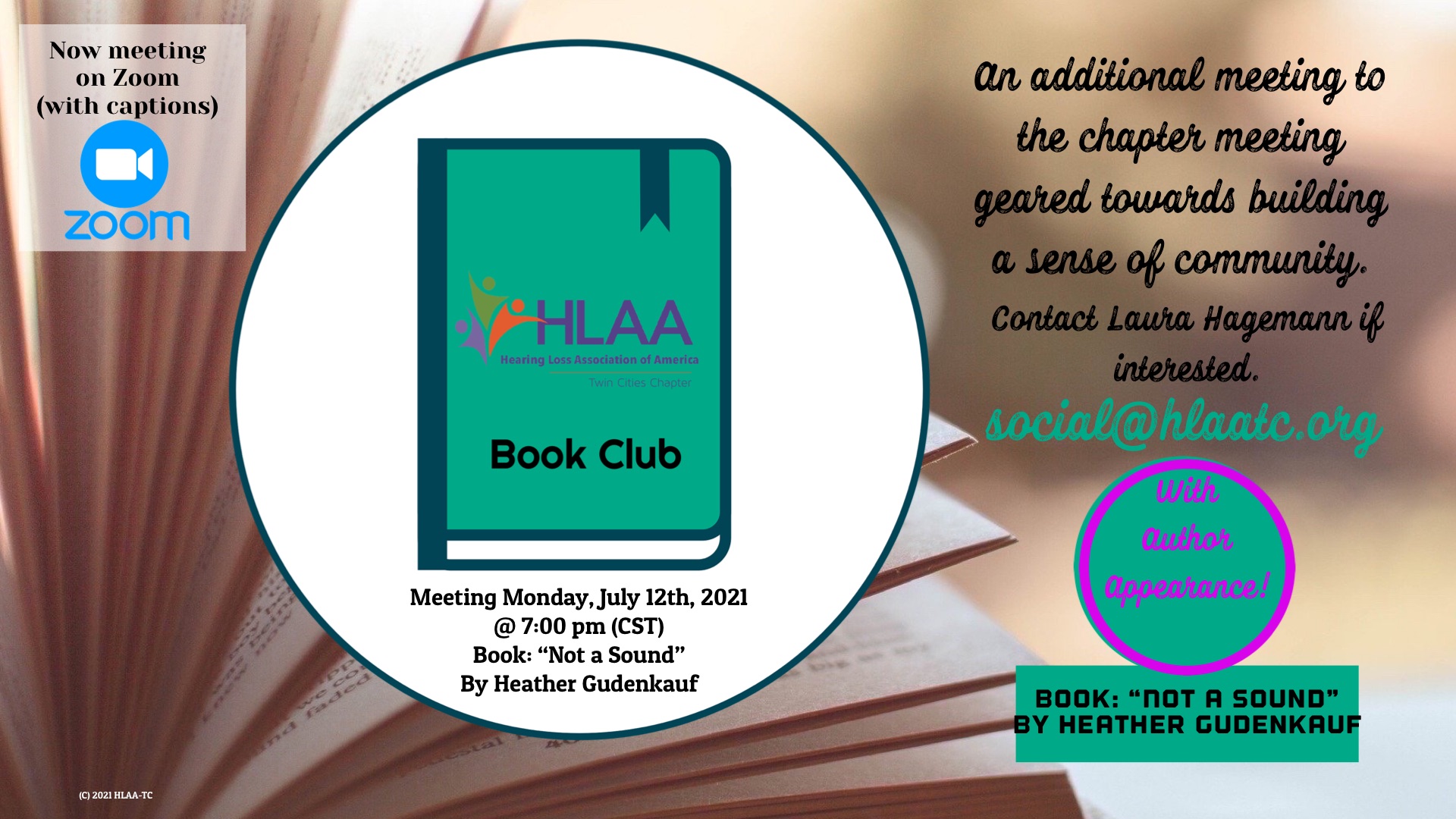 Earlier it was announced that our next HLAA-TC book club was going to be on July 7th. Now we have shifted the date to Monday July 12th at 7:00 p.m. (CST) on Zoom (with captions). We will be discussing “Not a Sound” by Heather Gudenkauf and she will be joining us for the discussion! Last book club we had the author join us for our Zoom discussion and we are lucky that is happening again for this next book club! HLAA-TC Book Club is a separate and additional meeting to the HLAA-TC monthly chapter meetings. The book club is open to anyone (HLAA members or not) who wants to join the discussion.