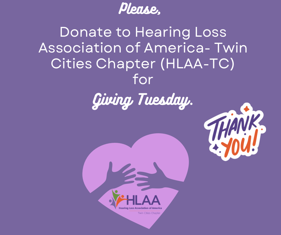 The Tuesday after Thanksgiving (today, Tuesday, November 29, 2022) has been named “Giving Tuesday” and people are encouraged to donate to charities and nonprofits they support. It’s a good time to focus what can be a flurry of holiday spending (Black Friday, Small Business Saturday, and Cyber Monday) on donating to charitable organizations. After participating in the Minnesota “Give To The Max Day” on November 17th, our donation page is still up and accepting donations. So, if you have the means, we at Hearing Loss Association of America- Twin Cities chapter (HLAA-TC) would greatly appreciate your donations.