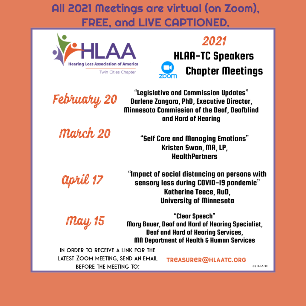 We have scheduled all the speakers for the remainder of this season (through May) and you can view the list on our website here. The next monthly chapter meeting is February 20th, and Darlene Zangara, Executive Director of the Minnesota Commission of the Deaf, DeafBlind and Hard of Hearing will be the speaker and give a Commission and legislative update. Representative Brian Daniels will also speak with information about the upcoming legislative session. Please email Lionel before the meeting at treasurer@hlaatc.singlerdesign.com in order to receive a link for the February 20th Zoom meeting. Like most meetings, social time starts at 9:30 am and Darlene Zangara begins her talk at 10:00 am. Representative Daniels will also talk at this time about a bill he is presenting to the Minnesota House of Representatives.