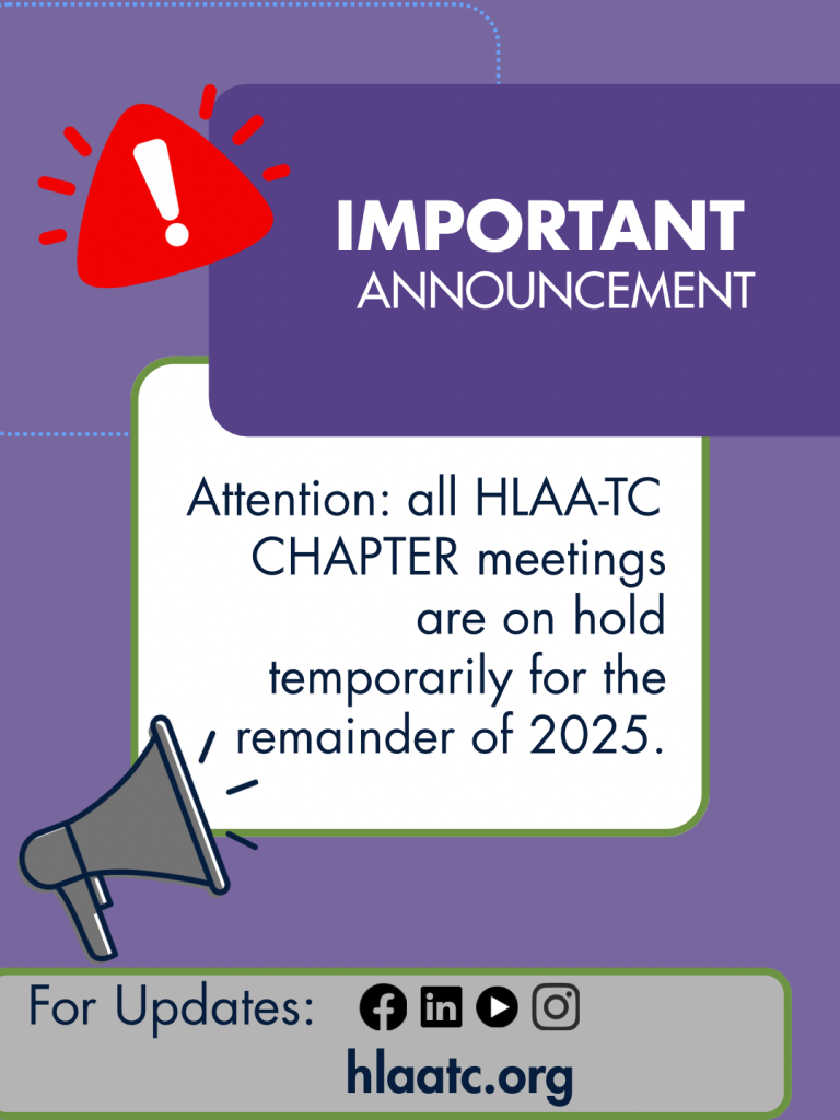 Attention: all HLAA-TC CHAPTER meetings are on hold temporarily for the remainder of 2025. Please read the November 2025 HLAA-TC newsletter for more details.
