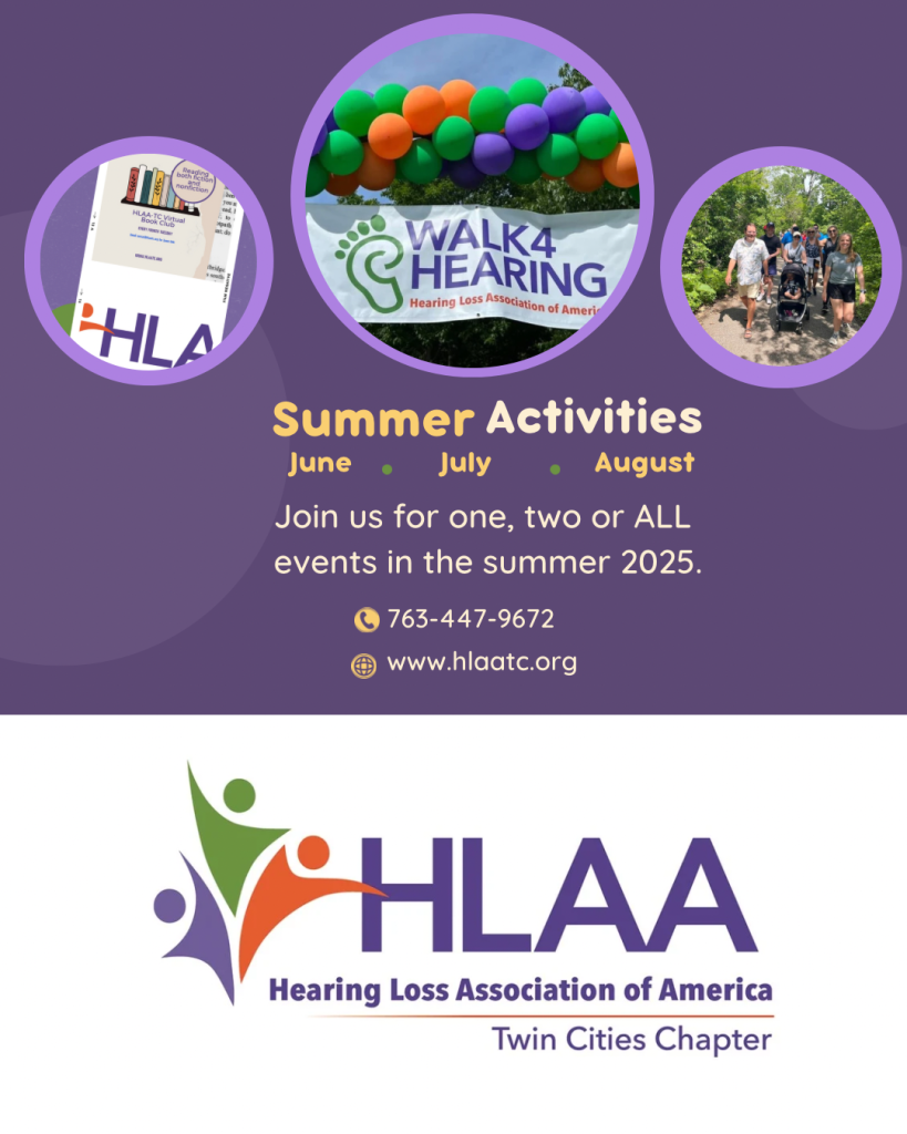 JUNE EVENT: Saturday, June 21, 2025, At Como Park, St. Paul, MN,  9:30am Register, 11:15am Walk “Twin Cities Walk 4 Hearing.” (Visit our Walk4Hearing page for more information about participating and/donating.)