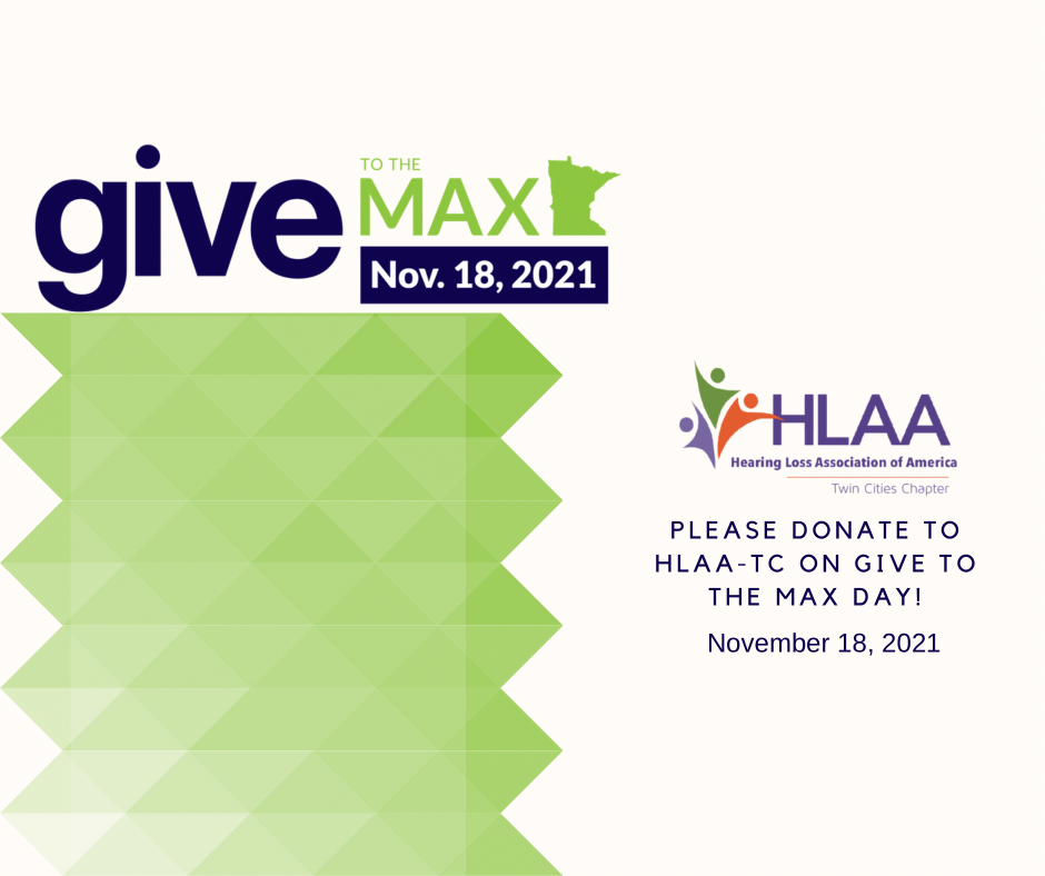 HLAA-TC will again be participating in the annual initiative to help raise money for charities and nonprofits called “Give to the Max Day.” It’s on November 18th this year. It’s a day when participating charities and nonprofits have a chance to receive extra money through GiveMN. We participated the last two years and are hoping to continue to raise money that we will use to expand our outreach to those with hearing loss in greater Minnesota.