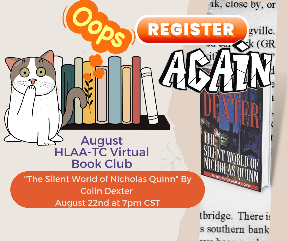 August BOOK CLUB: Tuesday, August 22nd 7:00 p.m. – 8:30 p.m. The HLAA-TC Book Club will be meeting on Zoom to discuss the mystery novel “The Silent World of Nicholas Quinn” by Colin Dexter (fiction/mystery). BARD/NLS: BARD only: DB 108526.