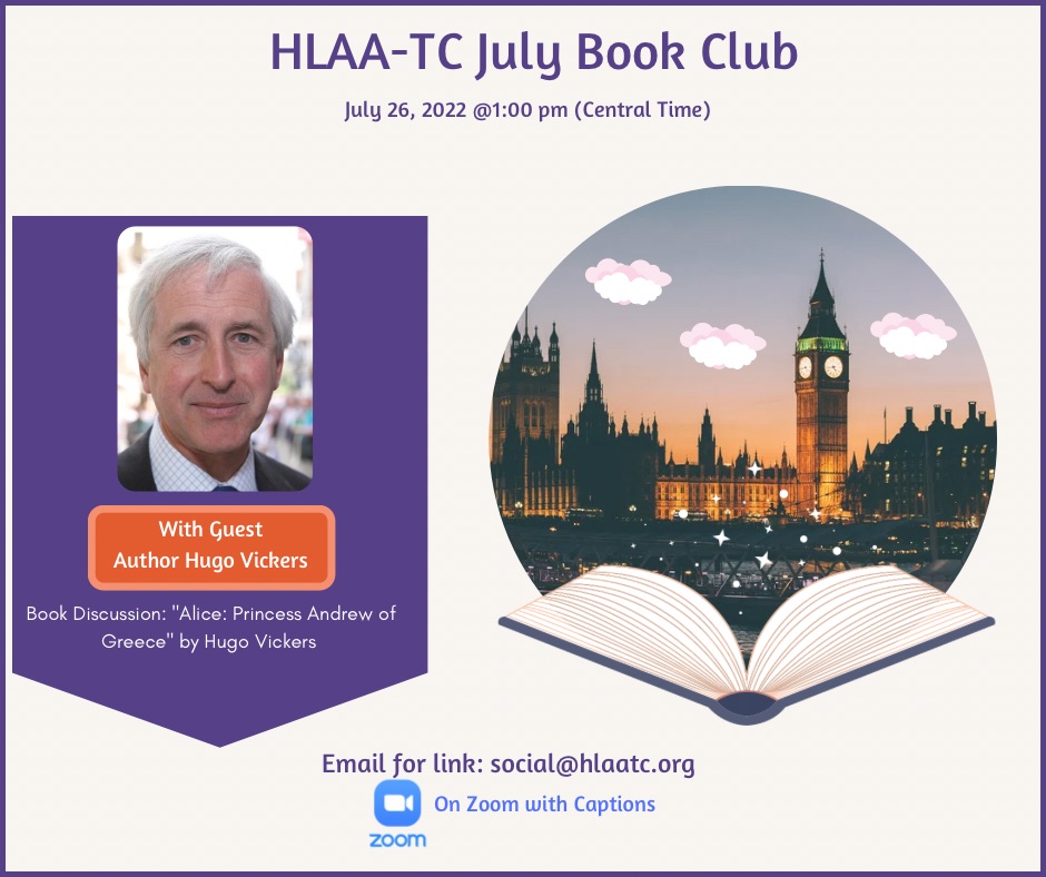 Please join us on Tuesday, July 26, 2022 at 1:00 pm (Central Time) for our discussion of “Alice: Princess Andrew of Greece” by Hugo Vickers with a discussion of the book with author Hugo Vickers.