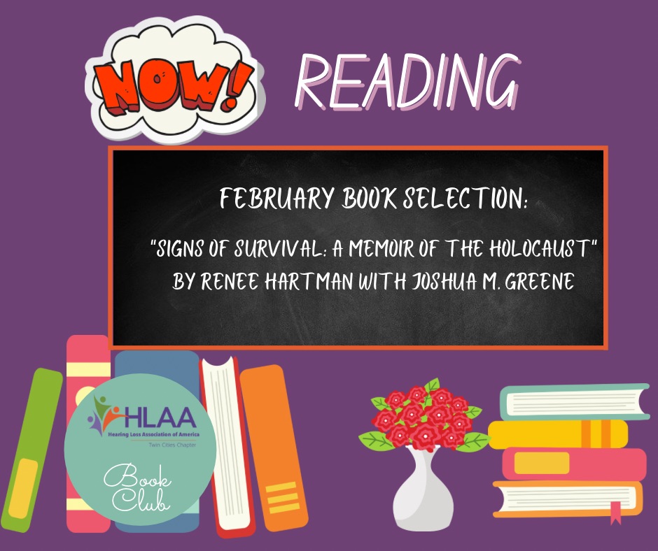 As we mentioned earlier, the HLAA-TC Book Club is taking a break in January. However, we already have the first several books chosen for 2022. The nonfiction book we are reading for February is “Signs of Survival: A Memoir of the Holocaust” by Renee Hartman with Joshua M. Greene. We haven’t selected a date for the February book club but we will announce it on our new Book Club page on our website.