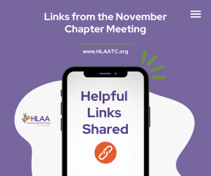 Thank you to our presenters: Dr. Susan Arquette, PhD (retired psychologist) and Tobias Wilde, MSW, LICSW for their presentation during the November chapter meeting on mental health and hearing loss. There will be a detailed summary in the next newsletter, but in the meantime see below for a list of links shared during the meeting. The presentation and question and answers were recorded so we will be putting it up on our HLAA-TC YouTube channel soon (EDIT: The Video is now Up. View it: https://www.youtube.com/watch?v=l4YXf4nSKOU&t=8s) When the video goes live it will be linked on our website. You can always find links to videos on our Video page on our website: https://hlaatc.singlerdesign.com/videos/