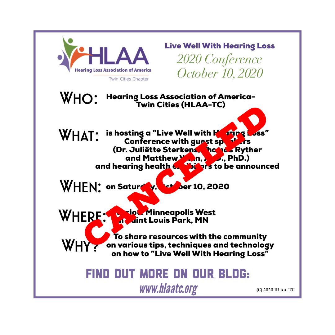 The “Live Well With Hearing Loss” 2020 Conference that was being hosted by Hearing Loss Association of America- Twin Cities Chapter (HLAA-TC) has been canceled by our Board due to concerns about COVID-19. The conference was scheduled for Saturday, October 10, 2020, at the Marriott Minneapolis West in Saint Louis Park, Minnesota. We have talked about the conference in detail on this blog (we started this blog up again in 2019 to start promoting the “Live Well With Hearing Loss” 2020 Conference).
