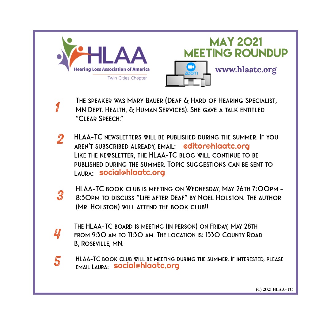 HLAA-TC book club will continue to meet (with virtual meetings) during the summer. Future books and meeting times will always be posted on our blog and social media. As always, if interested in attending the book club please email Laura Hagemann at social@hlaatc.singlerdesign.com (and she will send you the meeting link). The HLAA-TC newsletter will also release a few issues during the summer. If you would like to subscribe, please email: editor@hlaatc.singlerdesign.com