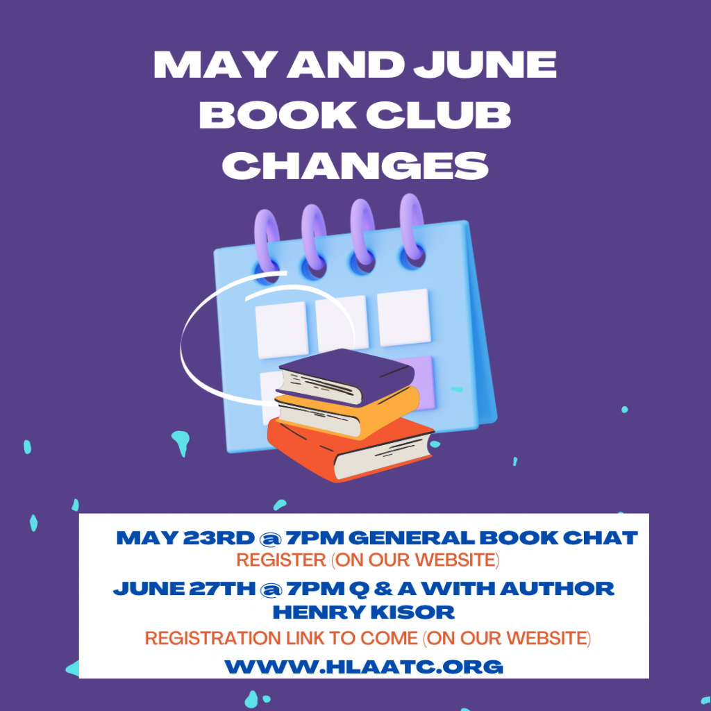 As always, everyone is welcome to Book Club and we enjoy welcoming new and familiar faces for each Zoom book club (every fourth Tuesday of the month, year-round). Book Clubs are always captioned and typically run 1.5 to 2 hours. If you are interested in more information about the book clubs, please visit the Book Club page on our website (where you can see what we have read and what we plan to read for the rest of 2023). You can also email Laura Hagemann social@hlaatc.singlerdesign.com for more information.