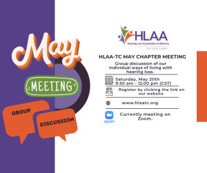 For the May 20th chapter meeting of HLAA-TC we will not have a speaker and are instead having a “Group discussion of our individual ways of living with hearing loss.” This will be an open discussion with everyone in attendance where all are encouraged to share tips and our individual ways of living with hearing loss. We will be talking about hearing aids, technology, telecoils, and practical advice on handling hearing loss in social situations, etc. If you have something to share, please join us, or join us to learn new information (or both).