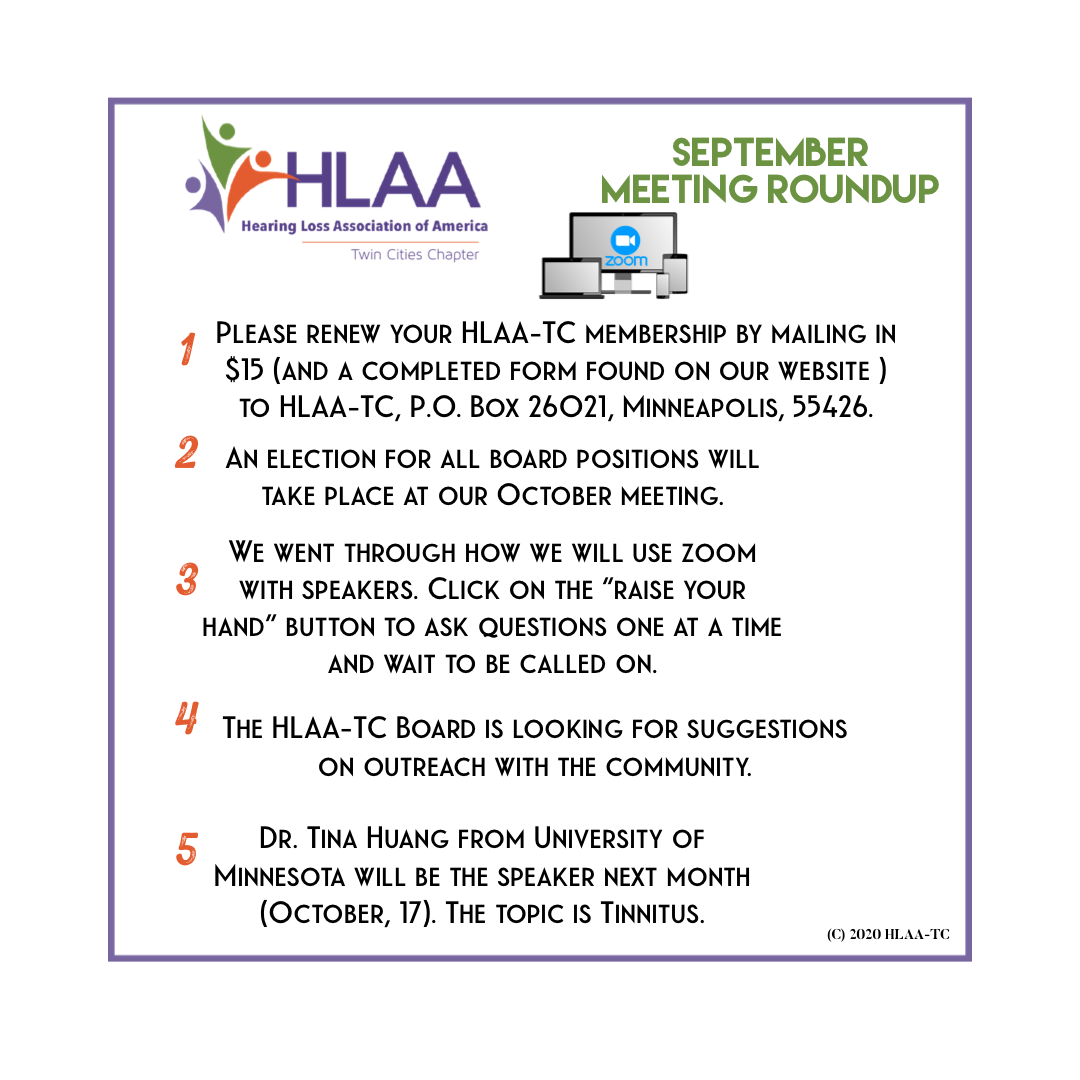 In addition to the more detailed meeting notes that are published in each monthly newsletter, we have decided to include a brief visual synopsis of each meeting. We are calling this feature a “Meeting Roundup” and this is the one for our most recent meeting that we had Saturday, September 19th on Zoom. Our next meeting will be on Saturday, October, 17 at 9:30 a.m. Dr. Tina Huang from the University of Minnesota will be talking about Tinnitus. A link to register for the October meeting will be in the October newsletter.