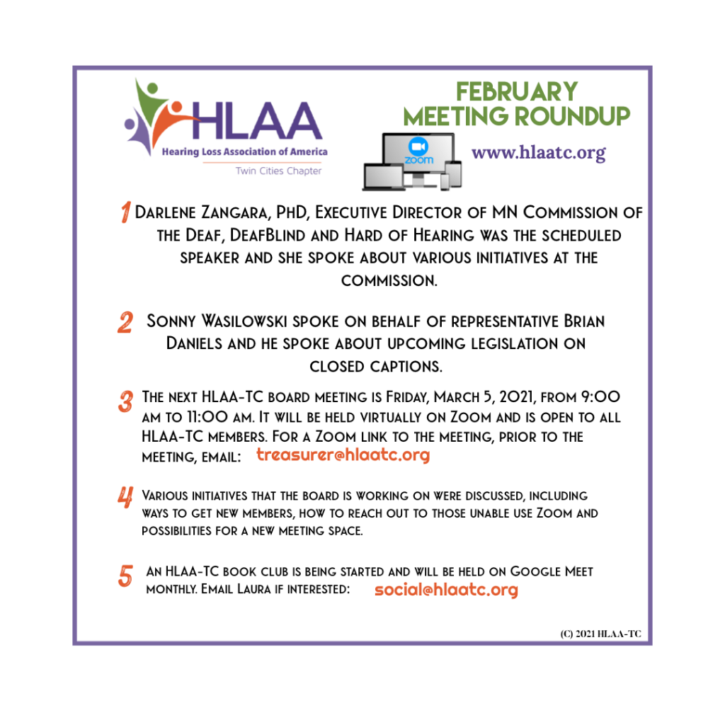 The HLAA-TC board is having a scheduled Zoom meeting that is open to all HLAA-TC members. Matters of board and chapter business will be discussed. The board Zoom meeting will be Friday, March 5th from 9:00 am to 11:00 am. To receive a Zoom meeting link, before the meeting, email: treasurer@hlaatc.singlerdesign.com