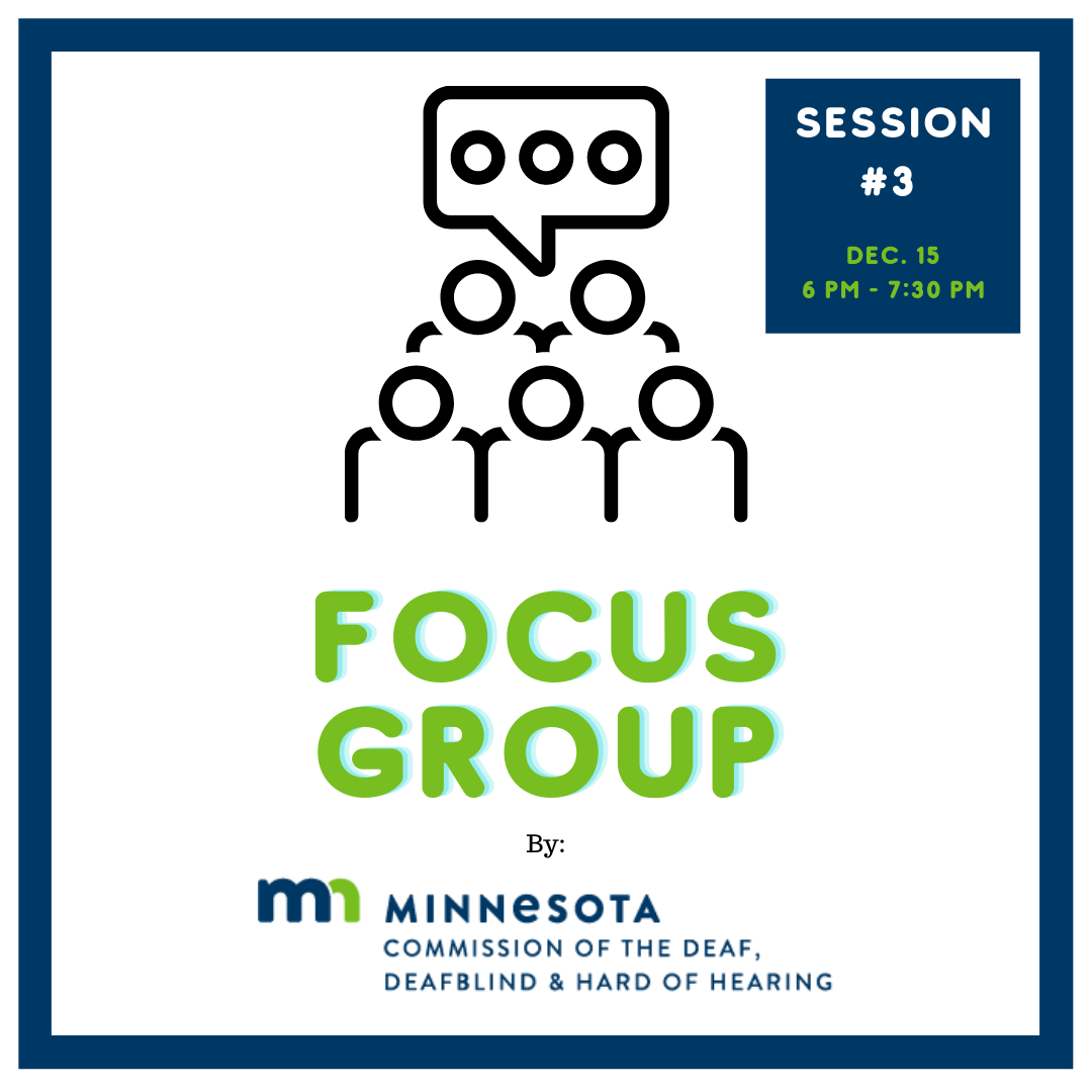 Earlier we had shared that the Minnesota Commission of the Deaf, DeafBlind and Hard of Hearing (MNCDHH) has been having a series of focus groups with members of the hearing loss community. The third and final focus group in that series will be on December 15th from 6:00 pm to 7:30 pm.
