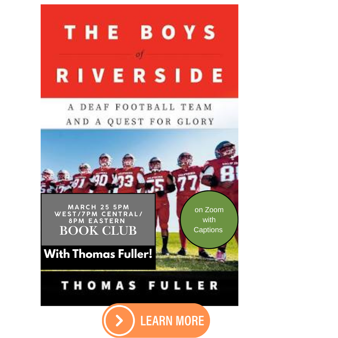 For March book club on the 25th we are having the author join us. In case you are interested in learning more while reading (or after finishing the book) and before book club, here are some links with more information about the March book club nonfiction book: “The Boys of Riverside: A deaf football team and a quest for glory” (nonfiction) by Thomas Fuller, BARD: DB124042. [ZOOM-Register Here]. The meeting is on Zoom with captions and open to all: MARCH BOOK CLUB: Tuesday, MARCH 25, 5:00 p.m. Western/ 7:00 p.m. Central/ 8:00 p.m. Eastern Time.