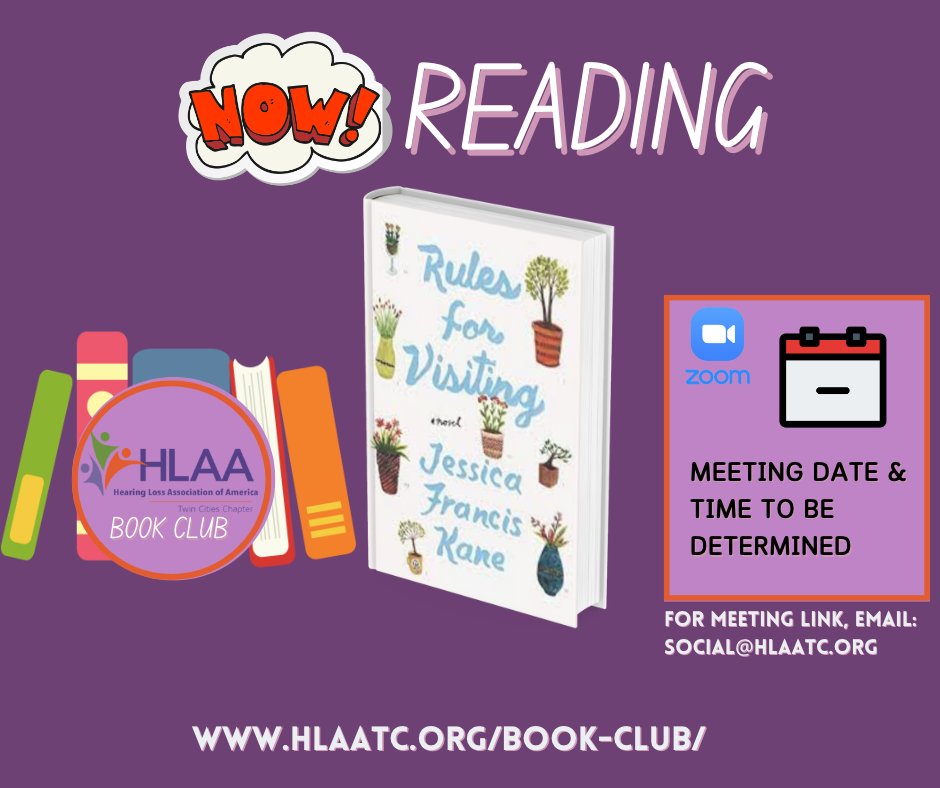 We haven’t yet determined if we will still meet in December or move our book club to January (since our usual meeting time hits around the holidays). We are also still discussing as a group the next several books that we will read. If you would like to be involved in that discussion (and if you have suggestions for books for us to read, etc.), please email Laura Hagemann (HLAA-TC Social Media Specialist) at social@hlaatc.singlerdesign.com