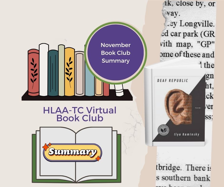 Thank you to the small group who attended HLAA-TC book club on Tuesday, November 26th to discuss the book of poetry “Deaf Republic” by Ilya Kaminsky. We didn’t have the author join us. Following is a list of points discussed with links. Reminder that we WON’T be having book club in December and have instead moved that book to January (more information at the end of this summary).