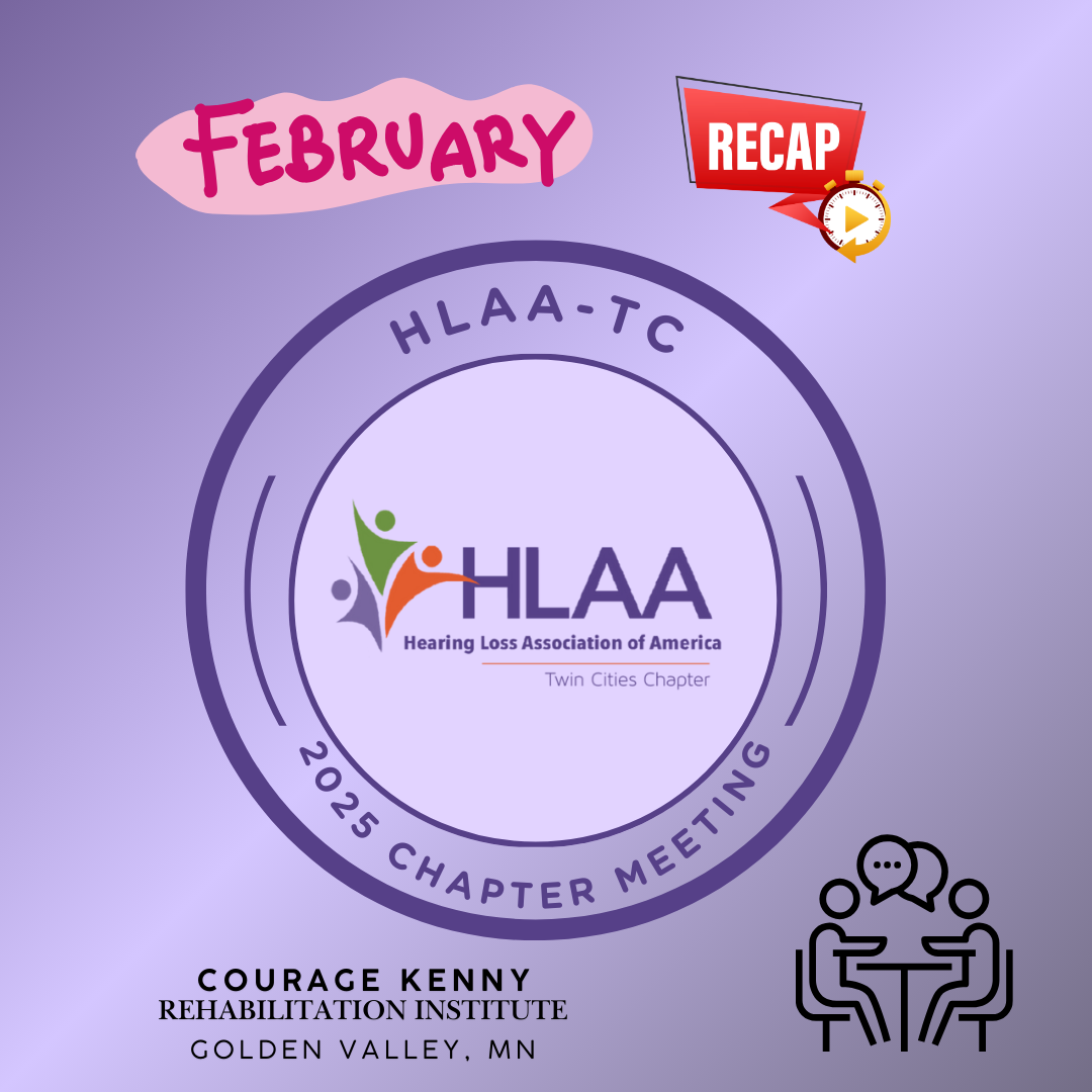 The February Chapter Meeting of HLAA-TC had Kim Fishman an audiologist from Hears to U (Clinic & Audiology in Hopkins, MN) present on “Equipment, accessories and products to help you hear better and take care of your ears.” The presentation will be on our HLAA-TC YouTube channel soon.