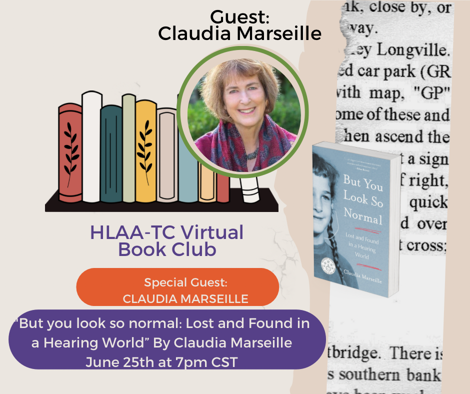 Reminder of the upcoming HLAA-TC Book Club meeting on Zoom this Tuesday June 25th at 7:00pm (Central Time). We will be discussing the memoir “But You Look So Normal: Lost and Found in a Hearing World” By Claudia Marseille. Author Claudia Marseille will be joining us! (So get your questions ready for Claudia!)