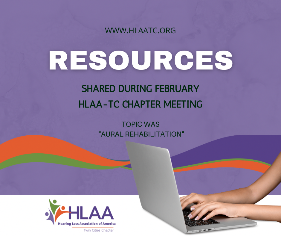 On Saturday, February 18th HLAA-TC had our February chapter meeting (on Zoom) and we had Nolan Johnson from MedEl speak to us about “Aural Rehabilitation.” In addition to the resources that Nolan Johnson shared, we also had some people in attendance who shared related and helpful information.