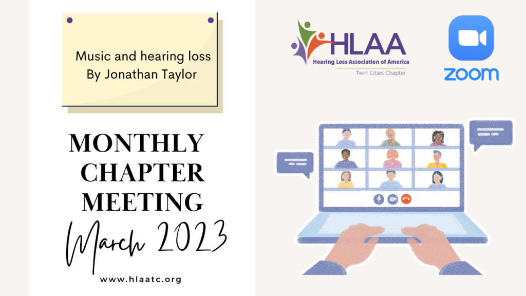 Thank you to those who joined us for another virtual/Zoom meeting on Saturday, March 18th and thank you to our speaker. Jonathan Taylor spoke to us about music and hearing loss. Jonathan performed as a trombonist but after his hearing loss progressed Jonathan retired as a musician and has been active in his local HLAA- New York City Chapter (where he now serves as Vice President).