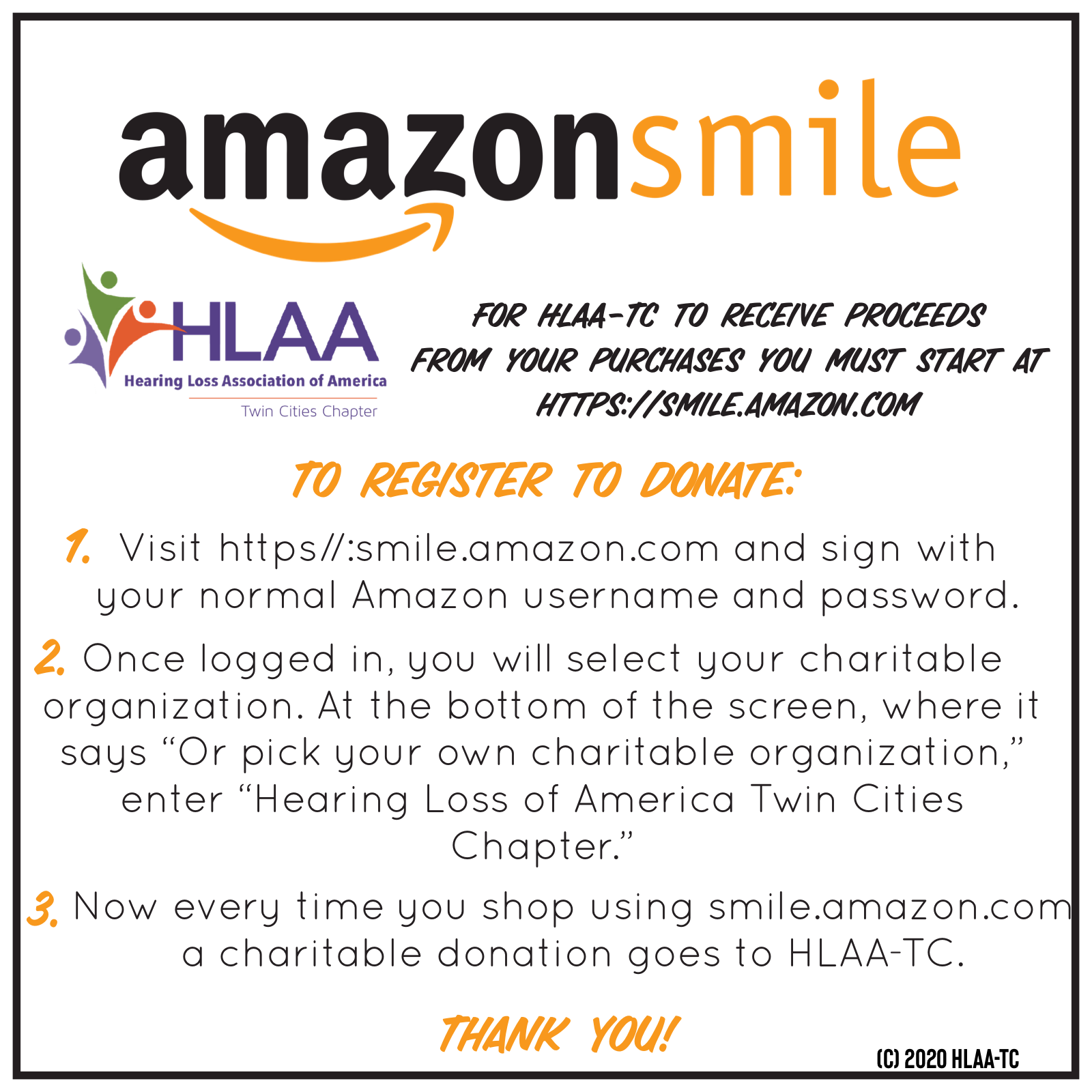 Amazon (the shopping website) has a program that allows charities and nonprofits like HLAA-TC to receive a small donation every time an Amazon customer shops using a special Smile URL and specifying HLAA-TC (actually “Hearing Loss of America Twin Cities Chapter”) as the charity to which they want to donate. HLAA-TC is registered as a 501(c)(3) with Amazon Smile so that you can choose to support “Hearing Loss of America Twin Cities Chapter” and a small portion of each of your Amazon Smile purchases are donated to HLAA-TC. Donation money will be used to fund our chapter activities and member outreach.